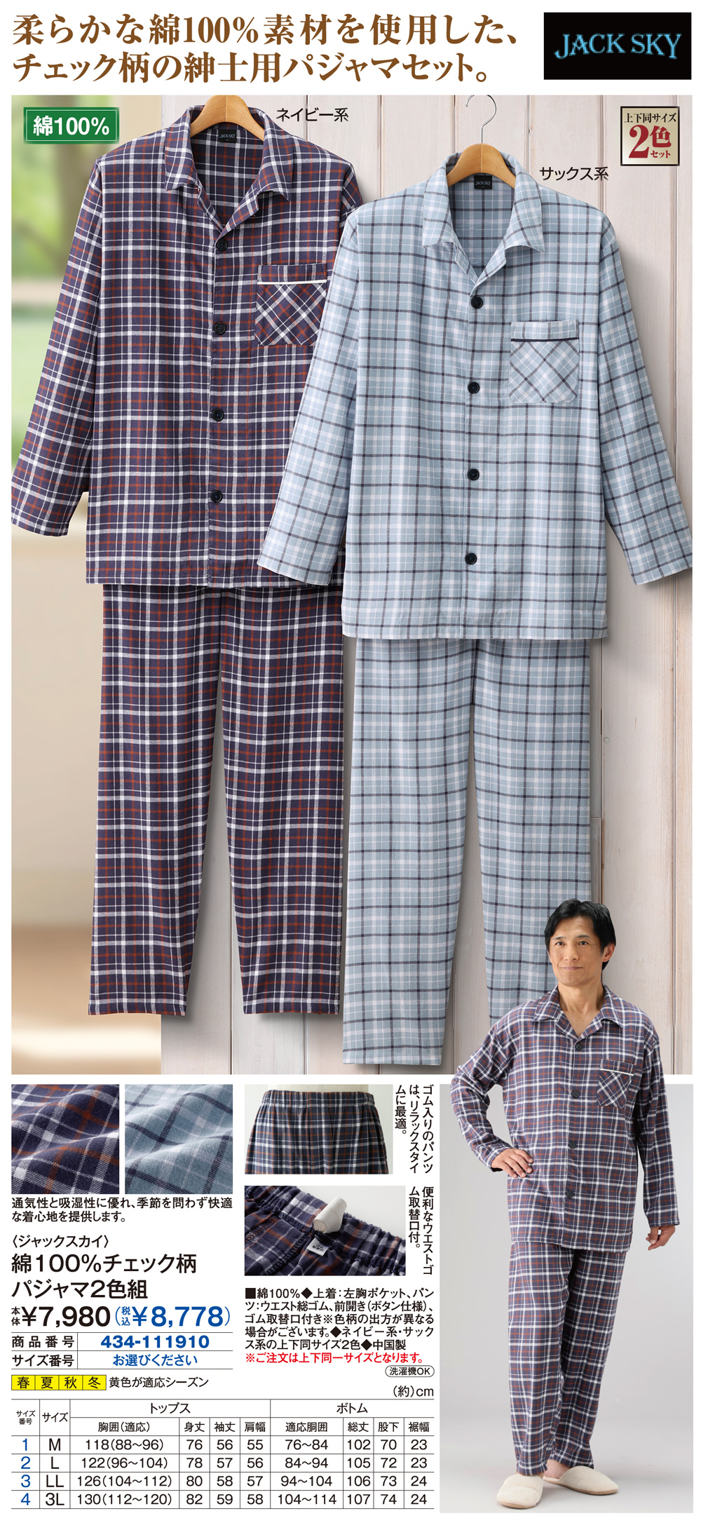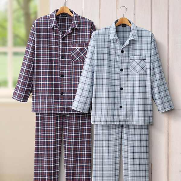 柔らかな綿100%素材を使用した、チェック柄の紳士用パジャマセット。 ゴム入りのパンツは、リラックスタイムに最適。 便利なウエストゴム取替口付。 通気性と吸湿性に優れ、季節を問わず快適な着心地を提供します。
