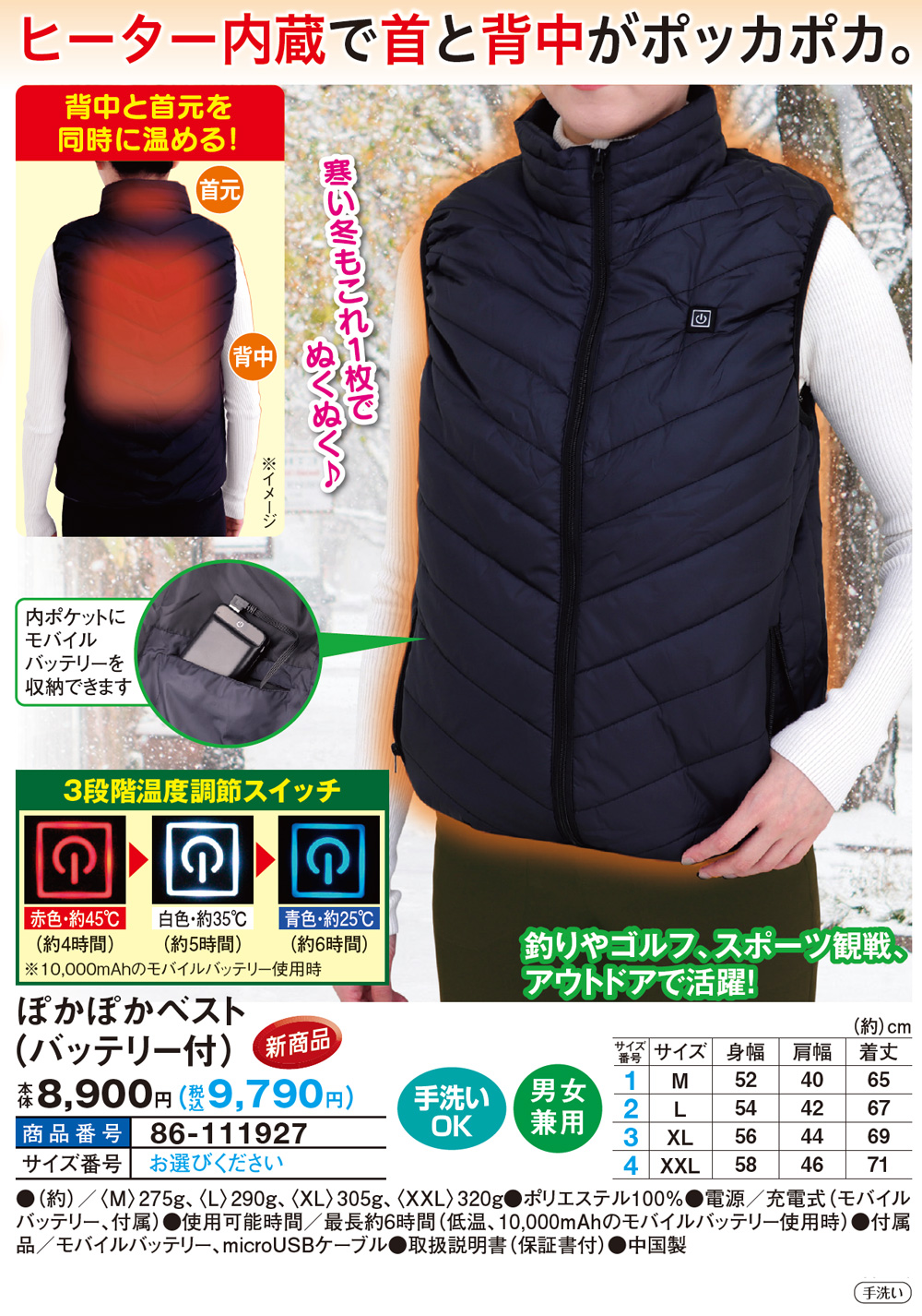 ●(約)/<M>275g、<L>290g、<XL>305g、<XXL>320g ●ポリエステル100% ●電源/充電式(モバイルバッテリー、付属) ●使用可能時間/最長約6時間(低温、10000mAhのモバイルバッテリー使用時) ●付属品/モバイルバッテリー、microUSBケーブル ●取扱説明書(保証書付) ●中国製
