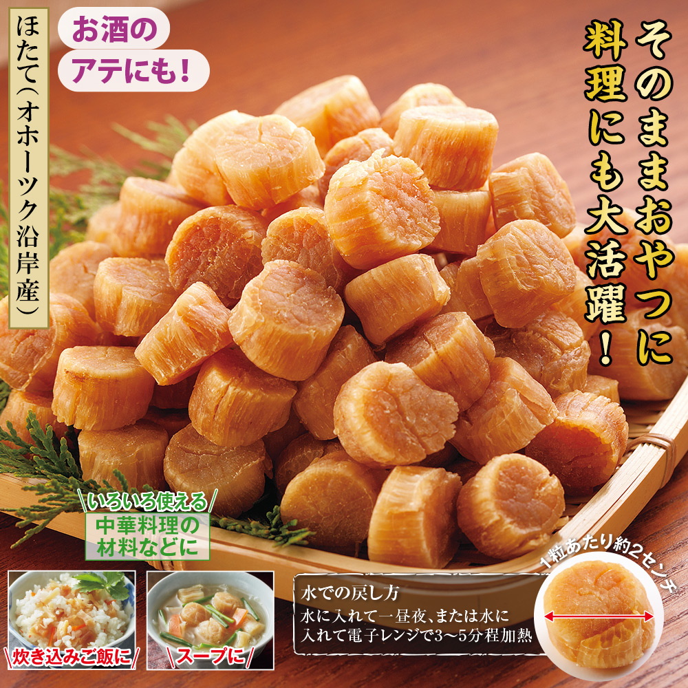 【ほたて(オホーツク沿岸産)】 北海道オホーツク海でとれた旬の帆立貝を厳選。新鮮なうちに塩茹でにし、じっくり乾燥させて旨みを凝縮させました。 北海道漁業協同組合連合会の品質管理の下、干し貝柱の中でも1等検の商品に仕上げたこだわりの逸品です。 いろいろ使える! 中華料理の材料などに。 炊き込みご飯に!スープに! 1粒あたり約2センチ 水での戻し方 水に入れて一昼夜、または水に入れて電子レンジで3〜5分程加熱。