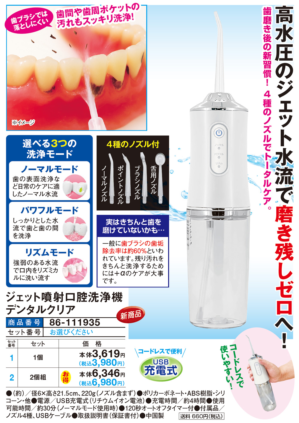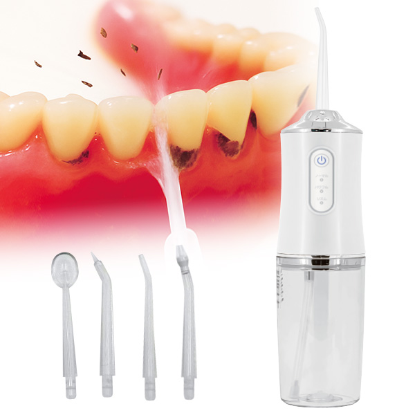 高水圧のジェット水流で磨き残しゼロへ! 歯磨き後の新習慣!4種のノズルでトータルケア。 歯ブラシでは落としにくい歯間や歯周ポケットの汚れもスッキリ洗浄! コードレスで使いやすい! 【4種のノズル付】 ●舌用ノズル ●ブラシノズル ●ポイントノズル ●ノーマルノズル 【選べる3つの洗浄モード】 ●ノーマルモード:歯の表面洗浄など日常のケアに適したノーマル水流 ●パワフルモード:しっかりとした水流で歯と歯の間を洗浄 ●リズムモード:強弱のある水流で口内をリズミカルに洗い流す 【実はきちんと歯を磨けていないかも…】 一般に歯ブラシの歯垢除去率は約60%といわれています。残り汚れをきちんと洗浄するためには+αのケアが大事です。 \コードレスで便利/ ●USB充電式