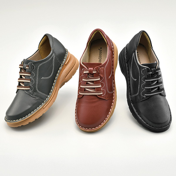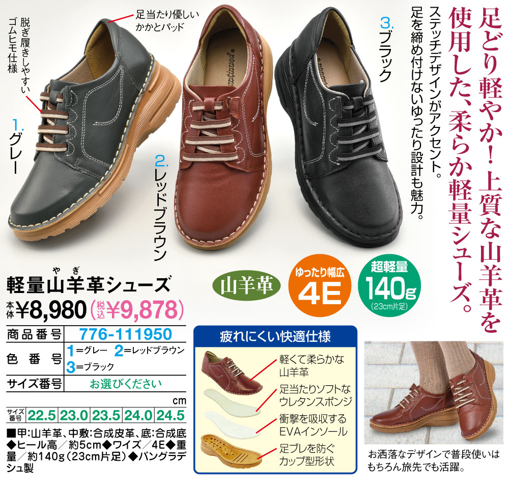 足どり軽やか!上質な山羊革を使用した、柔らか軽量シューズ! ステッチデザインがアクセント。 足を締め付けないゆったり設計も魅力。 お洒落なデザインで普段使いはもちろん旅先でも活躍。 足当たり優しいかかとパッド 脱ぎ履きしやすいゴムヒモ仕様 【疲れにくい快適仕様】 軽くて柔らかな山羊革 足当たりソフトなウレタンスポンジ 衝撃を吸収するEVAインソール 足ブレを防ぐカップ型形状 ●ゆったり幅広4E