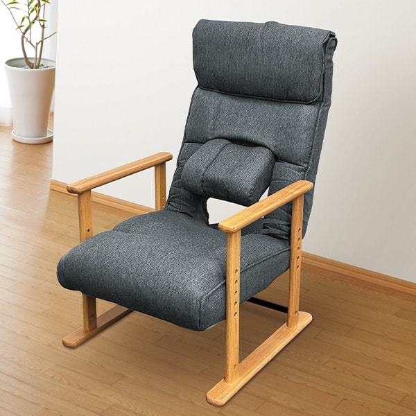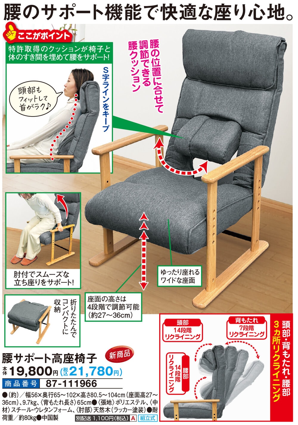 腰のサポート機能で快適な座り心地! 腰の位置に合せて調節できる腰クッション 【ここがポイント】 特許取得のクッションが椅子と体のすき間を埋めて腰をサポート! S字ラインをキープ 頭部もフィットして首がラク♪ 肘付でスムーズな立ち座りをサポート! 折りたたんでコンパクトに収納 ゆったり座れるワイドな座面 座面の高さは4段階で調節可能(約27~36cm) 【頭部・背もたれ・腰部3ヵ所リクライニング】 ●背もたれ:7段階リクライニング ●頭部:14段階リクライニング ●腰部:14段階リクライニング