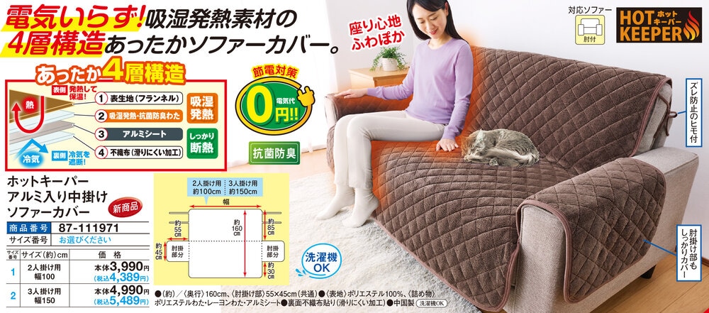 座り心地ふわぽか 【あったか4層構造】 〇表生地(フランネル) 〇吸湿発熱・抗菌防臭わた 〇アルミシート 〇不織布(滑りにくい加工) ●肘掛け部もしっかりカバー ●ズレ防止のヒモ付