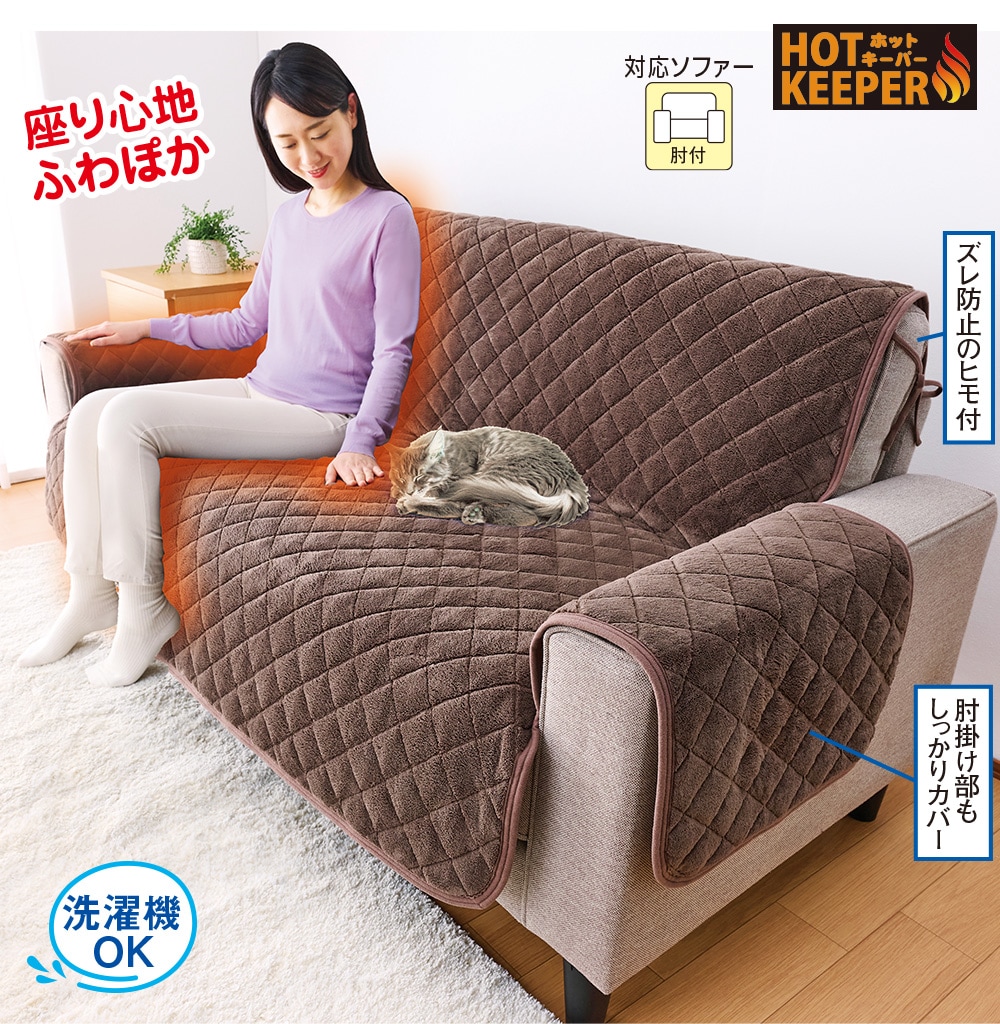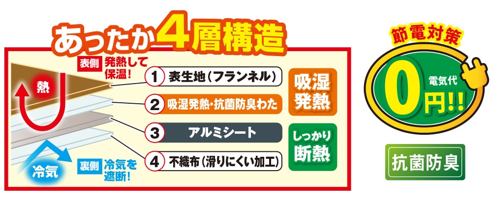 座り心地ふわぽか 【あったか4層構造】 〇表生地(フランネル) 〇吸湿発熱・抗菌防臭わた 〇アルミシート 〇不織布(滑りにくい加工) ●肘掛け部もしっかりカバー ●ズレ防止のヒモ付
