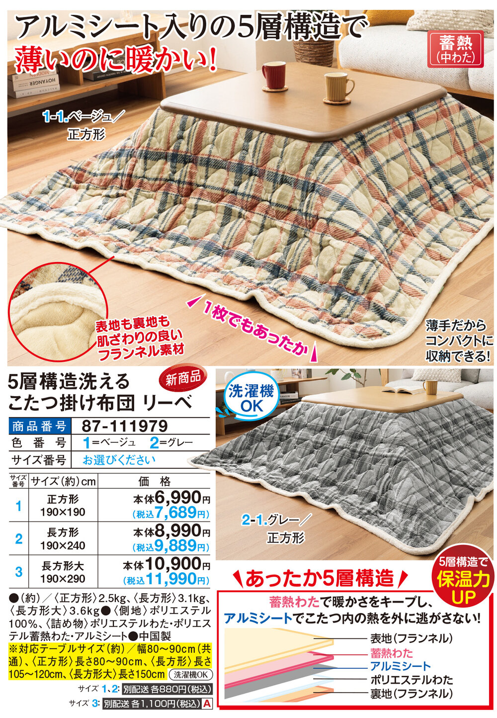 ●(約)/<正方形>2.5kg、<長方形>3.1kg、<長方形大>3.6kg ●<側地>ポリエステル100%、<詰め物>ポリエステルわた・ポリエステル蓄熱わた・アルミシート ●中国製