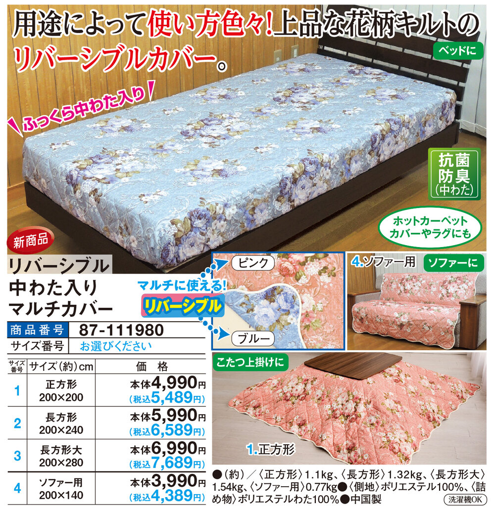 リバーシブル中わた入りマルチカバー