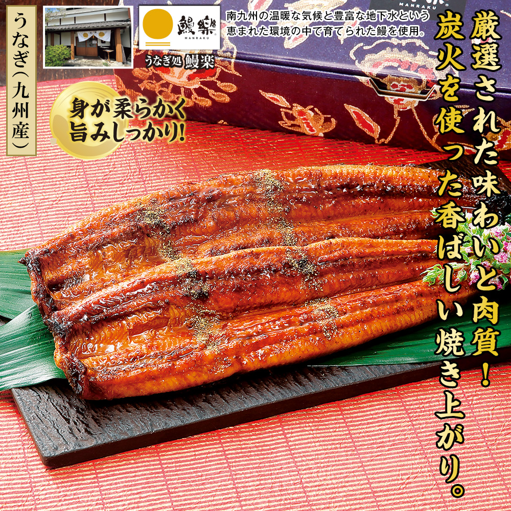 【うなぎ(九州産)】 身が柔らかく旨みしっかり! 南九州の温暖な気候と豊富な地下水という恵まれた環境の中で育てられた鰻を使用。 熟練した養鰻家が丹精込めて育てた九州産のうなぎを使用。 こだわりのたれ漬け・焼きを繰り返し丹念に焼き上げました。