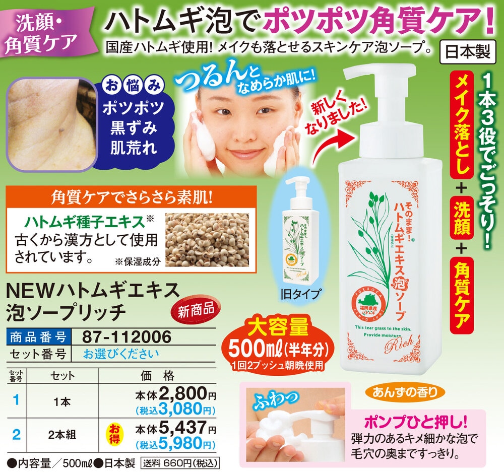 ハトムギ泡でポツポツ角質ケア! 洗顔・角質ケア 国産ハトムギ使用!メイクも落とせるスキンケア泡ソープ。 \つるんとなめらか肌に!/ 【お悩み】 ●ポツポツ ●黒ずみ ●肌荒れ \1本3役でごっそり!/ メイク落とし+洗顔+角質ケア 【角質ケアでさらさら素肌!】 ハトムギ種子エキス※は、古くから漢方として使用されています。 ※保湿成分 ポンプひと押し! ふわっ 弾力のあるキメ細かな泡で毛穴の奥まですっきり。 ●あんずの香り ●大容量500ml(半年分)※1回2プッシュ朝晩使用 ●福岡県産ハトムギ使用 ●新しくなりました!