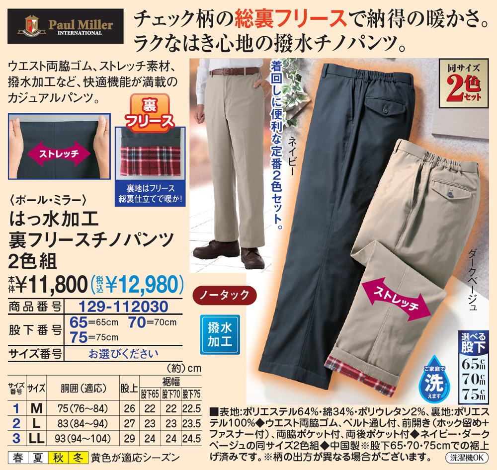 ポール・ミラー はっ水加工裏フリースチノパンツ2色組