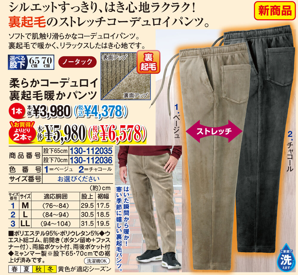 シルエットすっきり、はき心地ラクラク!裏起毛のストレッチコーデュロイパンツ! ソフトで肌触り滑らかなコーデュロイパンツ。 裏起毛で暖かく、リラックスしたはき心地です。 はいた瞬間から暖か!寒い季節に嬉しい裏起毛パンツ。 ●裏起毛 ●ノータック ●ストレッチ ●選べる