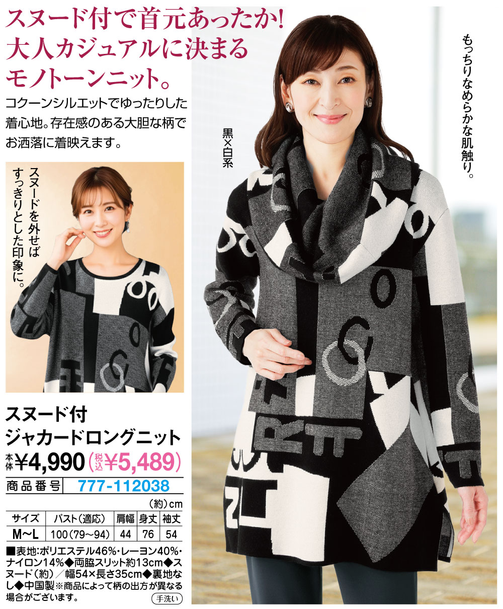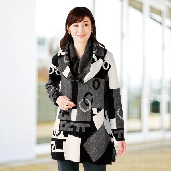 スヌード付で首元あったか!大人カジュアルに決まるモノトーンニット! コクーンシルエットでゆったりした着心地。存在感のある大胆な柄でお洒落に着映えます。 もっちりなめらかな肌触り。 スヌードを外せばすっきりとした印象に。
