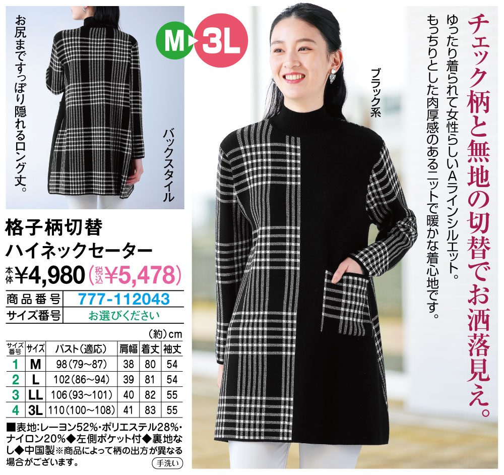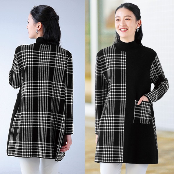 チェック柄と無地の切替でお洒落見え! ゆったり着られて女性らしいAラインシルエット。 もっちりとした肉厚感のあるニットで暖かな着心地です。 お尻まですっぽり隠れるロング丈。 ●M~3L