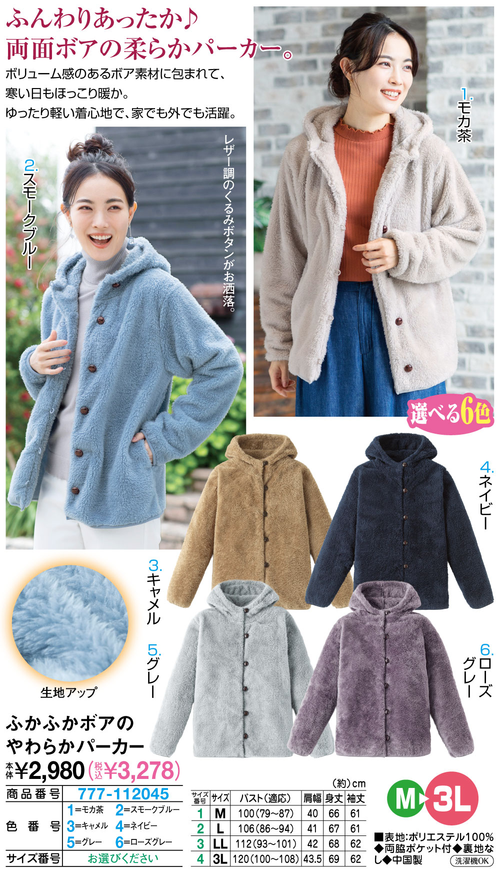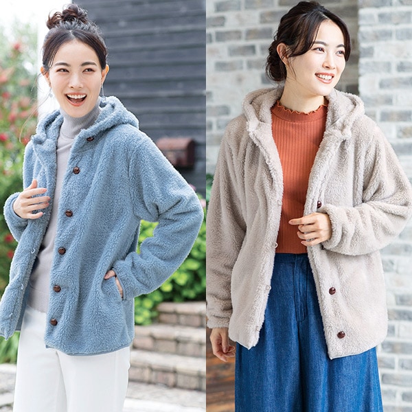 ふんわりあったか!両面ボアの柔らかパーカー! ボリューム感のあるボア素材に包まれて、寒い日もほっこり暖か。 ゆったり軽い着心地で、家でも外でも活躍。 レザー調のくるみボタンがお洒落。 ●選べる6色 ●M~3L
