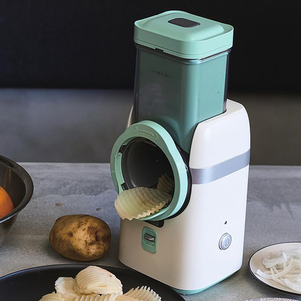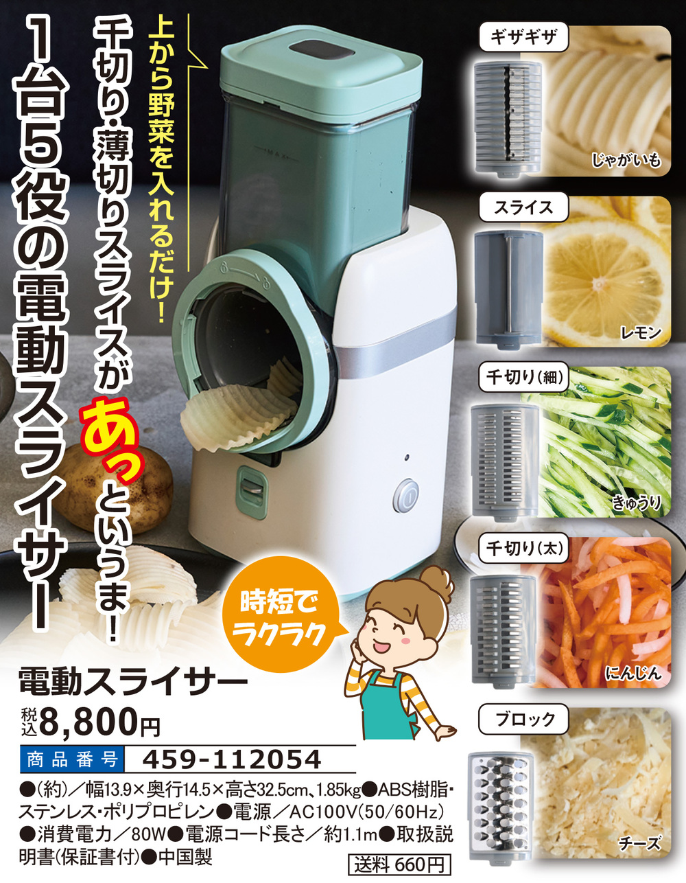 ●千切り・薄切りスライスがあっというま! 1台5役の電動スライサー ●上から野菜を入れるだけ! ●時短でラクラク
