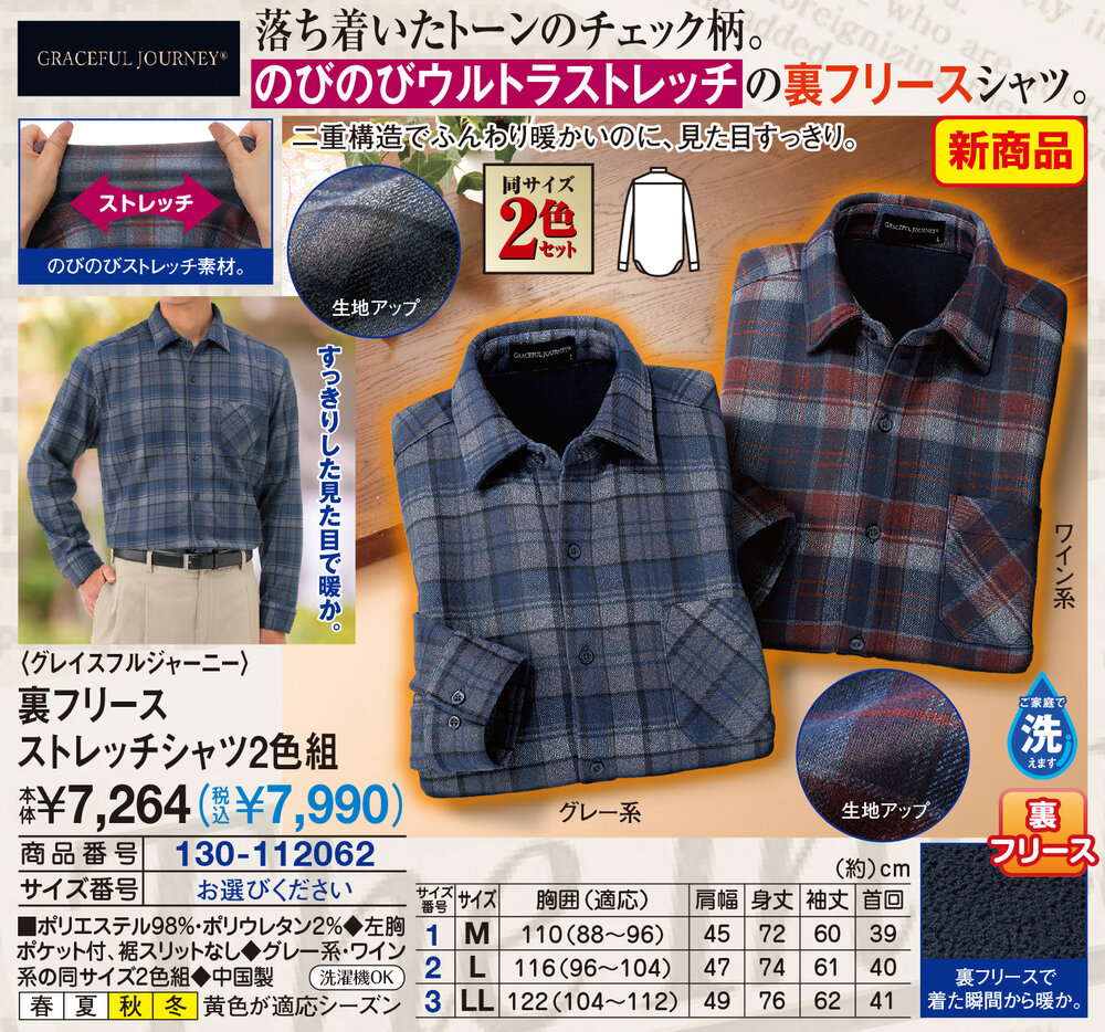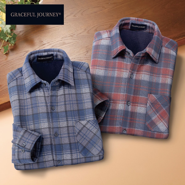 落ち着いたトーンのチェック柄!のびのびウルトラストレッチの裏フリースシャツ! 二重構造でふんわり暖かいのに、見た目すっきり。 のびのびストレッチ素材。 すっきりした見た目で暖か。 裏フリースで着た瞬間から暖か。 ●同サイズ2色セット ●裏フリース