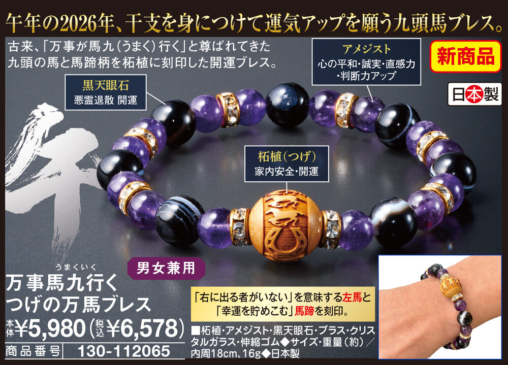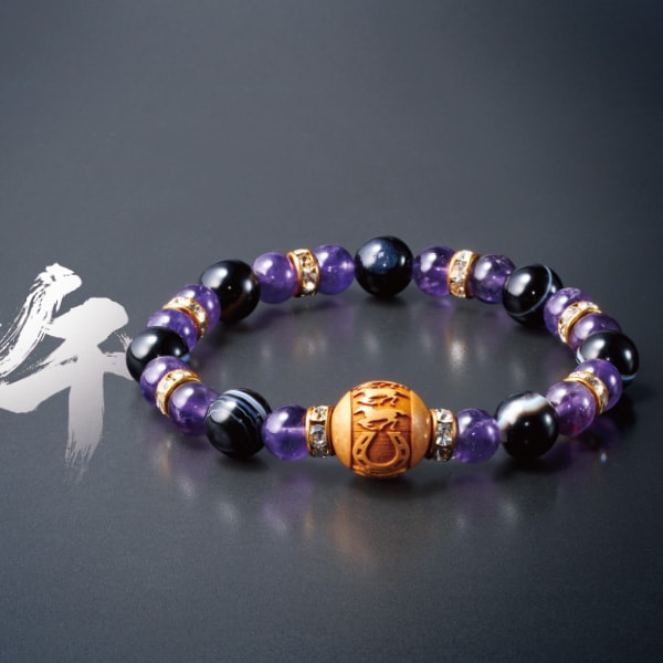 午年の2026年、干支を身につけて運気アップを願う九頭馬ブレス! 古来、「万事が馬九(うまく)行く」と尊ばれてきた九頭の馬と馬蹄柄を柘植に刻印した開運ブレス。 「右に出る者がいない」を意味する左馬と「幸運を貯めこむ」馬蹄を刻印。 ・アメジスト/心の平和・誠実・直感力・判断力アップ ・黒天眼石/悪霊退散 開運 ・柘植(つげ)/家内安全・開運 ●男女兼用