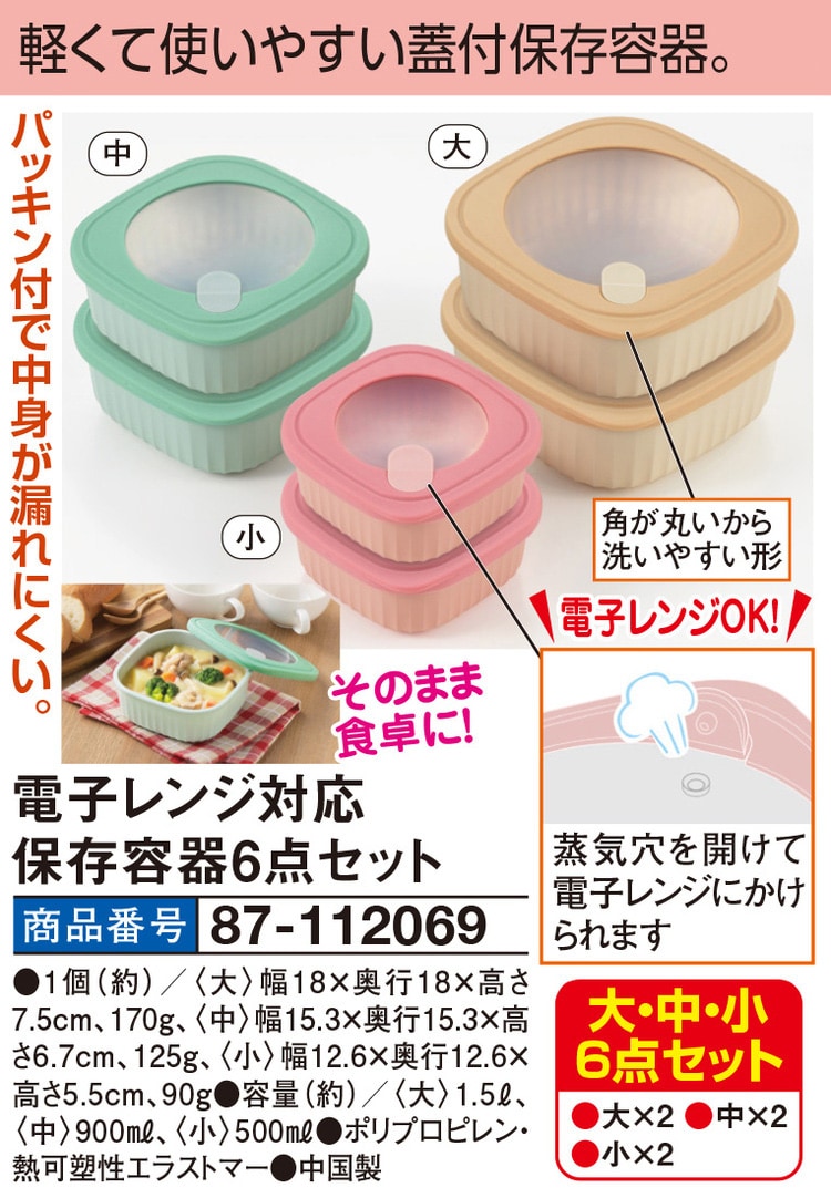 軽くて使いやすい蓋付保存容器! パッキン付で中身が漏れにくい。 角が丸いから洗いやすい形 電子レンジOK! 蒸気穴を開けて電子レンジにかけられます そのまま食卓に! 【大・中・小6点セット】 ●大×2 ●中×2 ●小×2