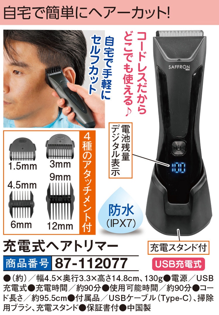 自宅で簡単にヘアーカット! コードレスだからどこでも使える♪ 自宅で手軽にセルフカット ●4種のアタッチメント付(1.5mm、3mm、4.5mm/6mm、9mm/12mm) ●電池残量デジタル表示 ●防水(IPX7) ●充電スタンド付 ●USB充電式