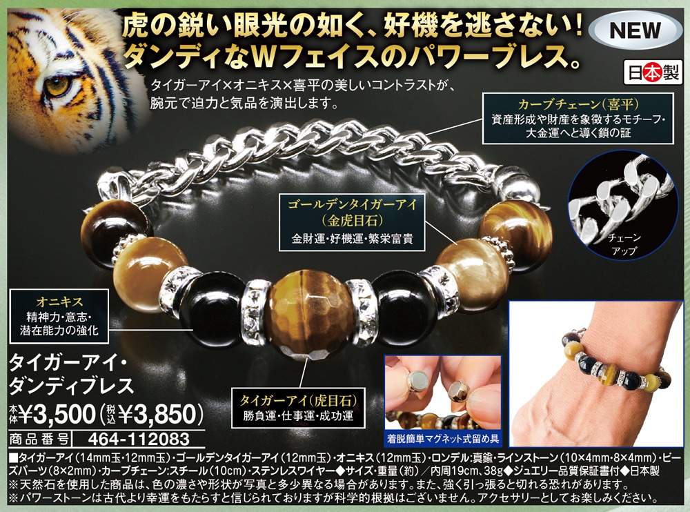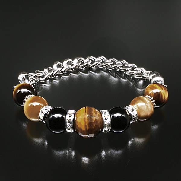 ■タイガーアイ(14mm玉・12mm玉)・ゴールデンタイガーアイ(12mm玉)・オニキス(12mm玉)・ロンデル:真鍮・ラインストーン(10×4mm・8×4mm)・ビーズパーツ(8×2mm)・カーブチェーン:スチール(10cm)・ステンレスワイヤー ◆サイズ・重量(約)/内周19cm、38g ◆ジュエリー品質保証書付 ◆日本製