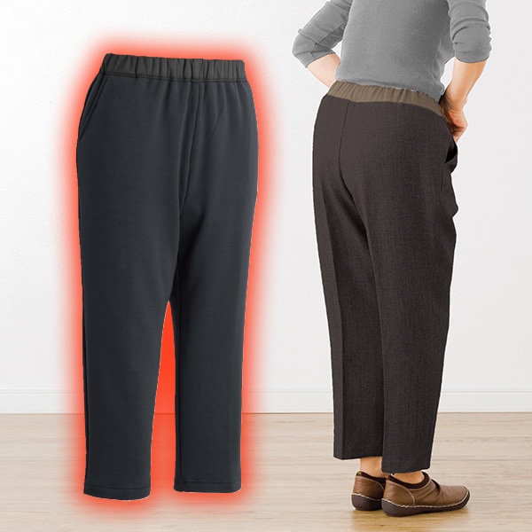 【サイズ(約)】 適応ウエスト、適応ヒップ、総丈、股下、裾幅 <S>(58~64)cm、(82~90)cm、81cm、55cm、17cm <M>(64~70)cm、(87~95)cm、82cm、55cm、17.5cm <L>(69~77)cm、(92~100)cm、83cm、55cm、18cm <LL>(77~85)cm、(97~105)cm、84cm、55cm、18.5cm <3L>(85~93)cm、(102~110)cm、85cm、55cm、19cm ■表地:ポリエステル95%・ポリウレタン5% ◆ウエスト総ゴム(ゴム取替口付)、両側ポケット付 ◆裏地あり(股下約12cmまで) ◆中国製