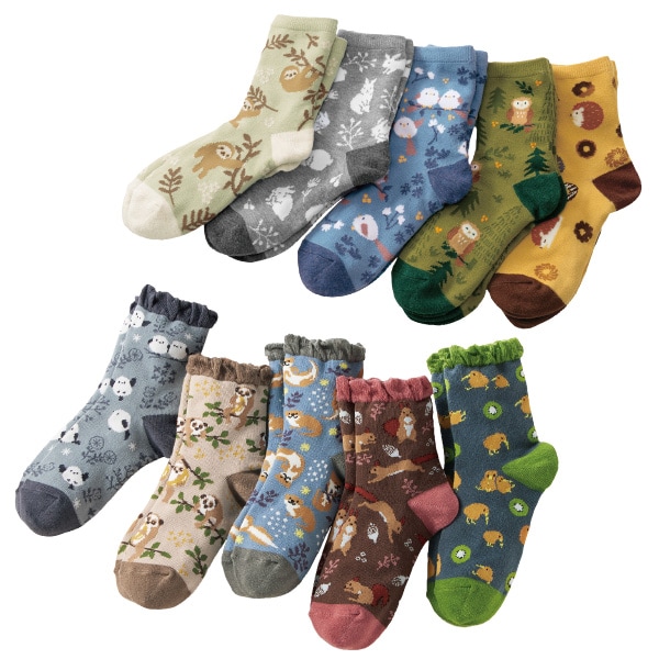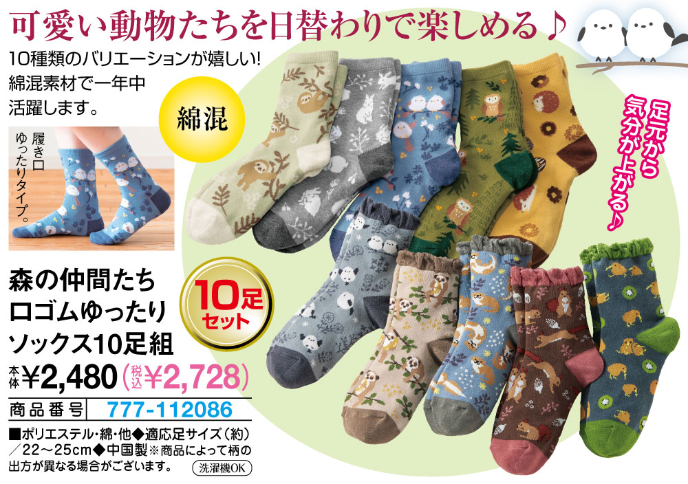 可愛い動物たちを日替わりで楽しめる♪ 10種類のバリエーションが嬉しい! 綿混素材で一年中活躍します。 足元から気分が上がる♪ 履き口ゆったりタイプ。 ●10足セット ●綿混