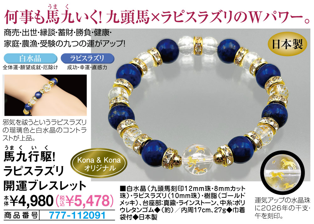 何事も馬九いく!九頭馬×ラピスラズリのWパワー! 商売・出世・縁談・蓄財・勝負・健康・家庭・農漁・受験の九つの運がアップ! 邪気を祓うというラピスラズリの瑠璃色と白水晶のコントラストが上品。 運気アップの水晶珠に2026年の干支・午を刻印。 【白水晶】 全体運・願望成就・厄除け 【ラピスラズリ】 成功・幸運・直感力