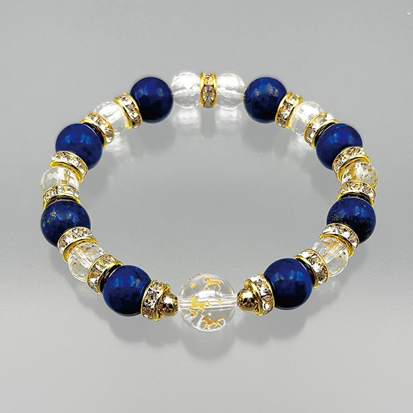 ■白水晶(九頭馬刻印12mm珠・8mmカット珠)・ラピスラズリ(10mm珠)・樹脂(ゴールドメッキ)、台座部:真鍮・ラインストーン、中糸:ポリウレタンゴム ◆(約)/内周17cm、27g ◆巾着袋付 ◆日本製