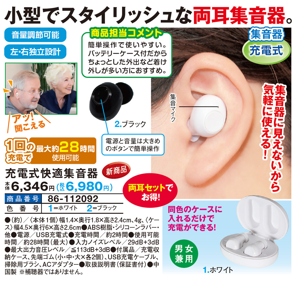 小型でスタイリッシュな両耳集音器! ●充電式集音器 ●音量調節可能 ●左・右独立設計 \アッ!聞こえる/ 集音器に見えないから気軽に使える! 【商品担当コメント】 簡単操作で使いやすい。 バッテリーケース付だからちょっとした外出など着け外しが多い方におすすめ。 ●1回の充電で最大約28時間使用可能 電源と音量は大きめのボタンで簡単操作 同色のケースに入れるだけで充電ができる! ●男女兼用 ●両耳セットでお得!