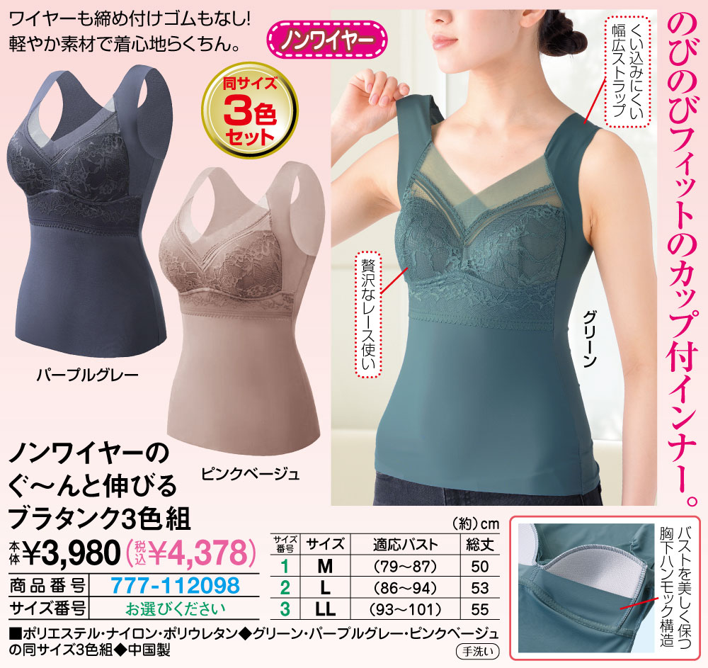 【サイズ(約)】 適応バスト、総丈 <M>(79~87)cm、50cm <L>(86~94)cm、53cm <LL>(93~101)cm、55cm ■ポリエステル・ナイロン・ポリウレタン ◆グリーン・パープルグレー・ピンクベージュの同サイズ3色組 ◆中国製