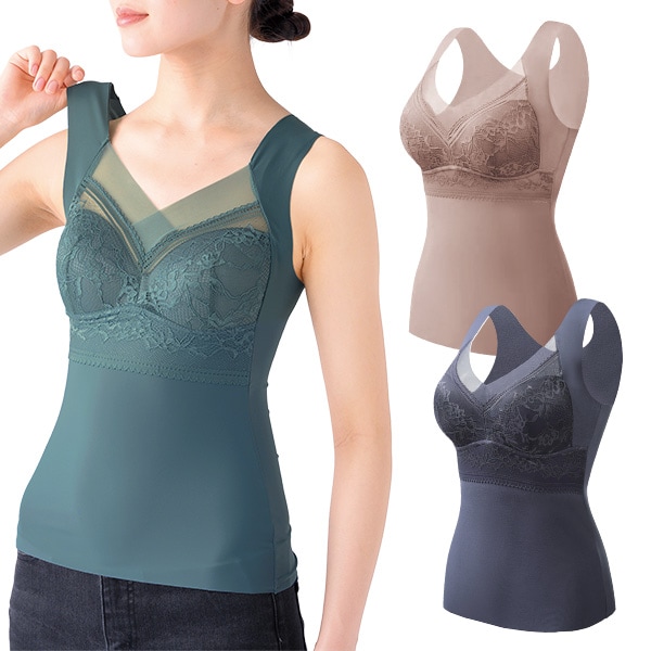 のびのびフィットのカップ付インナー! ワイヤーも締め付けゴムもなし! 軽やか素材で着心地らくちん。 くい込みにくい幅広ストラップ 贅沢なレース使い バストを美しく保つ胸下ハンモック構造 ●ノンワイヤー ●同サイズ3色セット