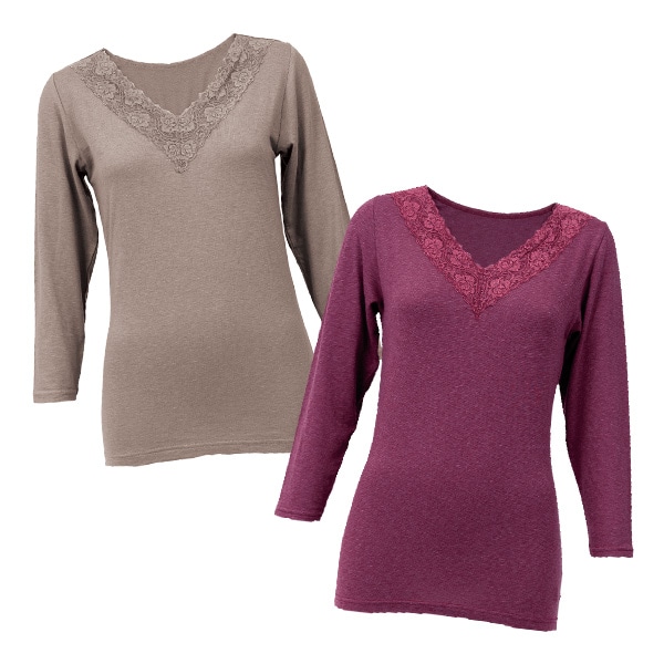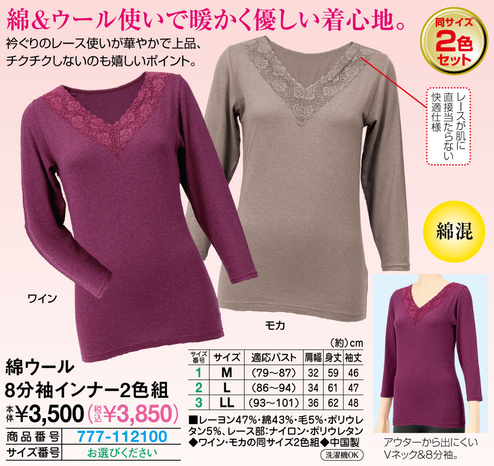 綿&ウール使いで暖かく優しい着心地! 衿ぐりのレース使いが華やかで上品、チクチクしないのも嬉しいポイント。 レースが肌に直接当たらない快適仕様 アウターから出にくいVネック&8分袖。 ●同サイズ2色セット ●綿混