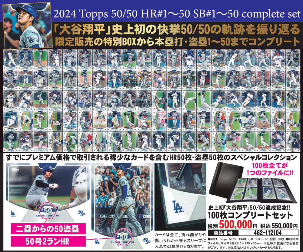 「大谷翔平」史上初の快挙50/50の軌跡を振り返る 限定販売の特別BOXから本塁打・盗塁1~50までコンプリート すでにプレミアム価格で取引される稀少なカードを含むHR50枚・盗塁50枚のスペシャルコレクション 100枚全てが1つのファイルに!! カードは全て、折れ曲がりや傷、汚れから守るスリーブに入れてのお届けとなります。