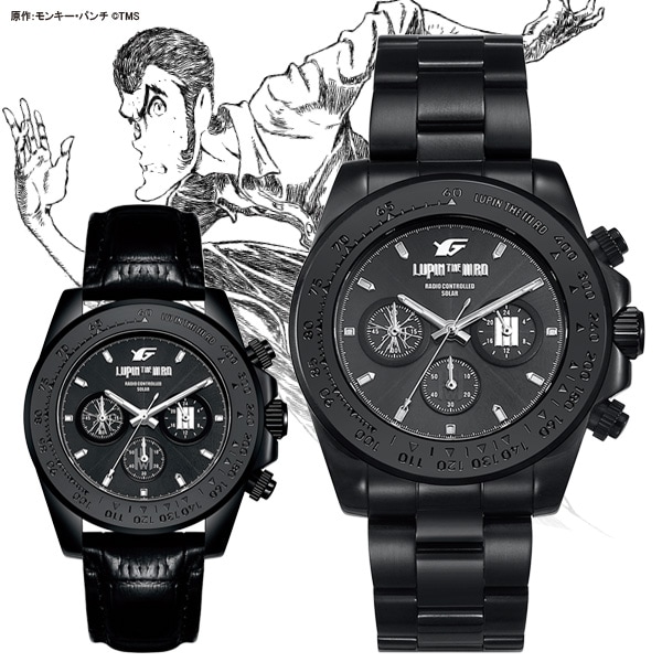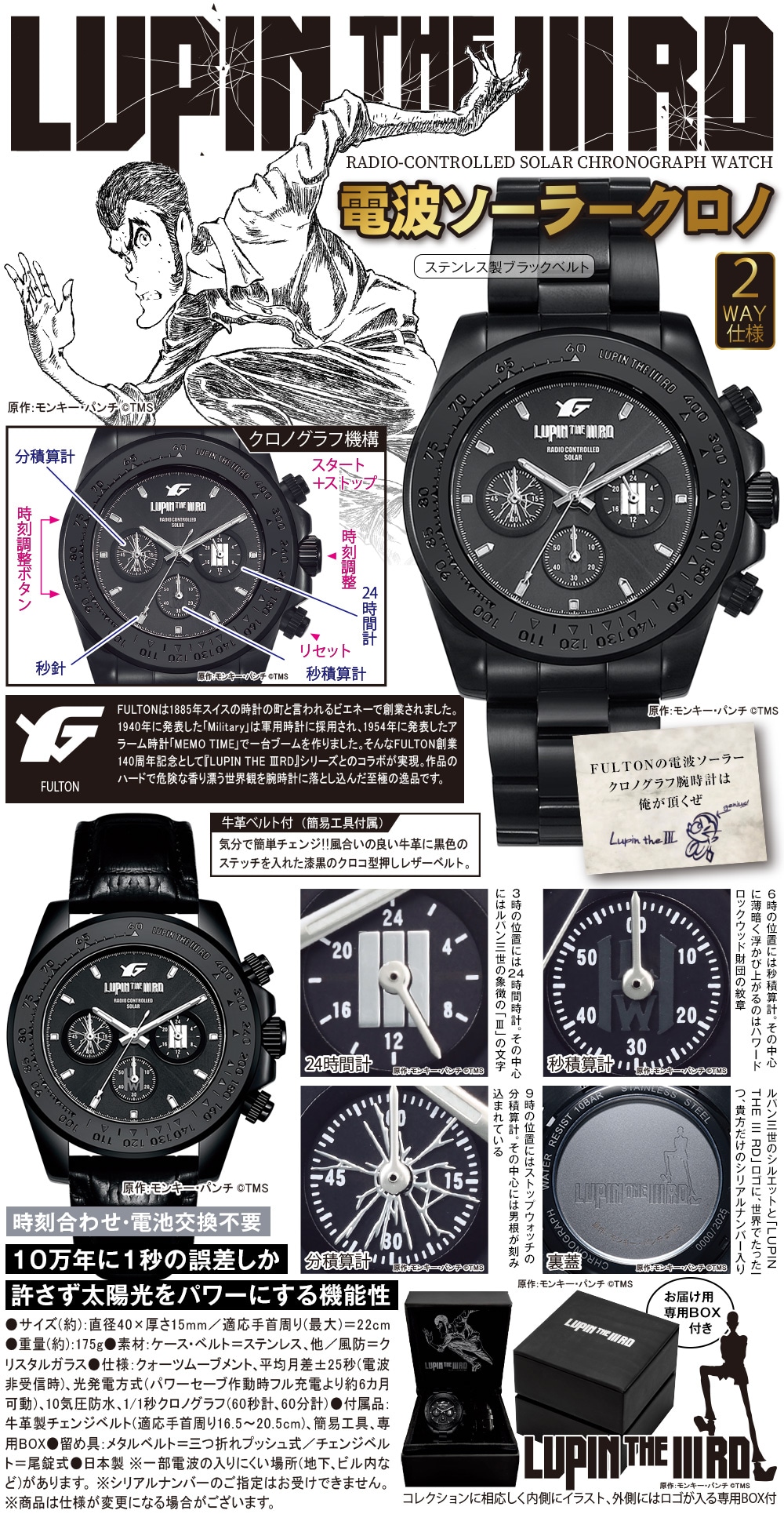 約30年ぶりの劇場版公開記念!電波ソーラークロノ 10万年に1秒の誤差しか許さず太陽光をパワーにする機能性 ベルトは気分でチェンジ2WAY仕様 ●風合いの良い牛革に黒色のステッチを入れた漆黒のクロコ型押しレザーベルト ●ステンレス製ブラックベルト 3時の位置には24時間計。 その中心にはルパン三世の象徴の『III』の文字。 9時の位置にはストップウォッチの分積算計。 その中心には弾痕が刻み込まれている。 6時の位置には秒積算計。 その中心に薄暗く浮かび上がるのはハワードロックウッド財団の紋章。 ルパン三世のシルエットと「LUPIN THE IIIRD」ロゴに、世界でたった一つ、貴方だけのシリアルナンバー入り 時刻合わせ・電池交換不要 コレクションに相応しく内側にイラスト、外側にはロゴが入る専用BOX付 FULTONは1885年スイスの時計の町と言われるビエネーで創業されました。 1940年に発表した「Military」は軍用時計に採用され、1954年に発表したアラーム時計「MEMO TIME」で一台ブームを作りました。 そんなFULTON創業140周年記念として『LUPIN THE IIIRD』シリーズとのコラボが実現。 作品のハードで危険な香り漂う世界観を腕時計に落とし込んだ至極の逸品です。