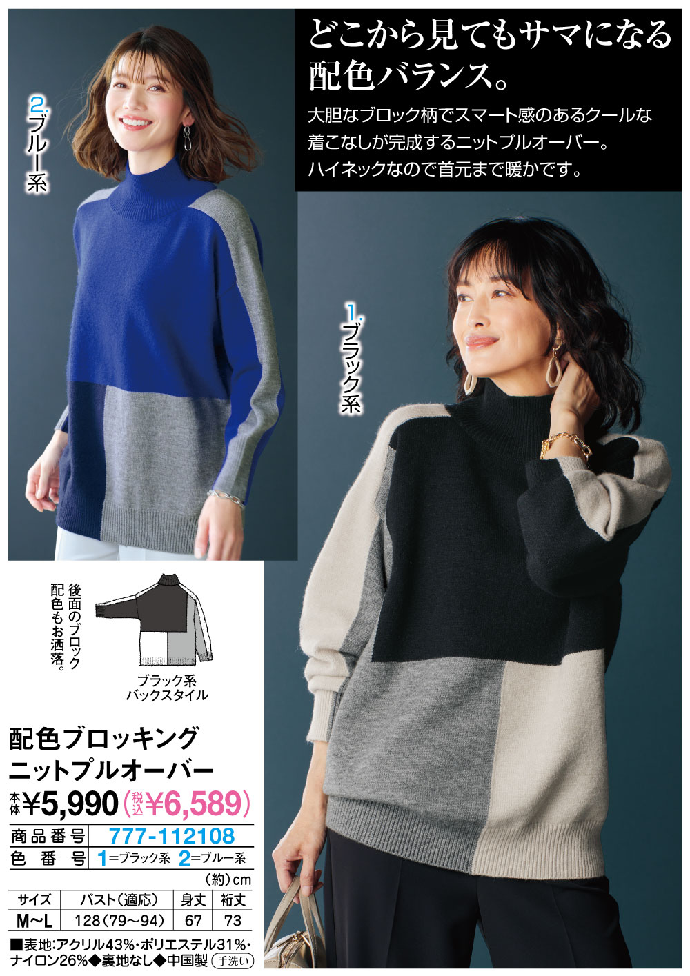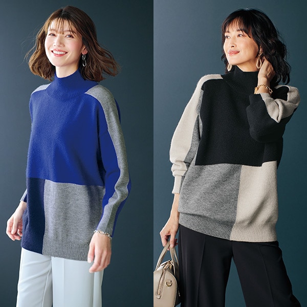 どこから見てもサマになる配色バランス! 大胆なブロック柄でスマート感のあるクールな着こなしが完成するニットプルオーバー。 ハイネックなので首元まで暖かです。 後面のブロック配色もお洒落。