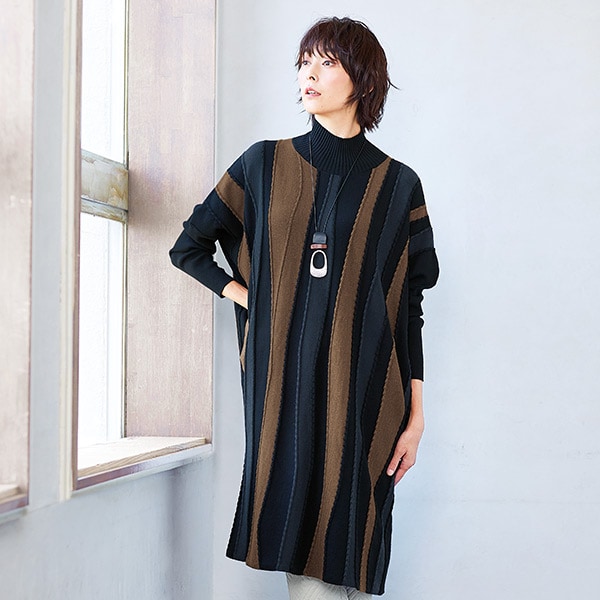 シックな配色で個性を発揮し、お出掛けスタイルをクラスアップ! ゆったりとした着心地なのに立体感のある縦ラインの編み柄ですっきり見え。 リブハイネックインナーを重ね着したようなデザインでスタイリッシュな装いに。