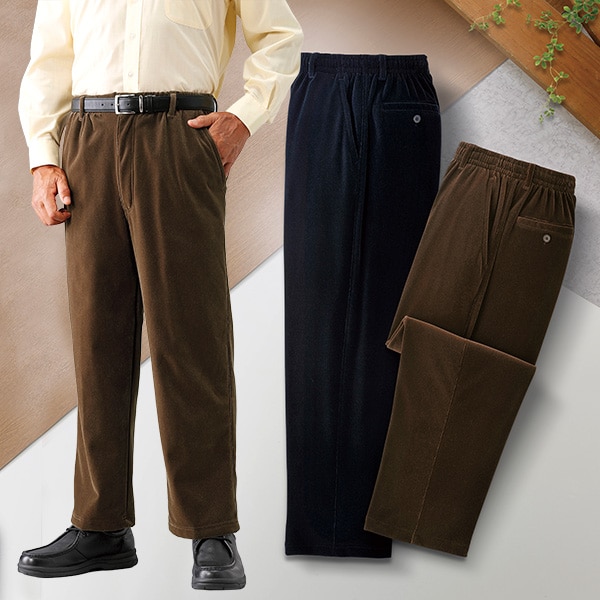 光沢感のある細畝コーデュロイが、洗練された印象を演出する裏フリースパンツ