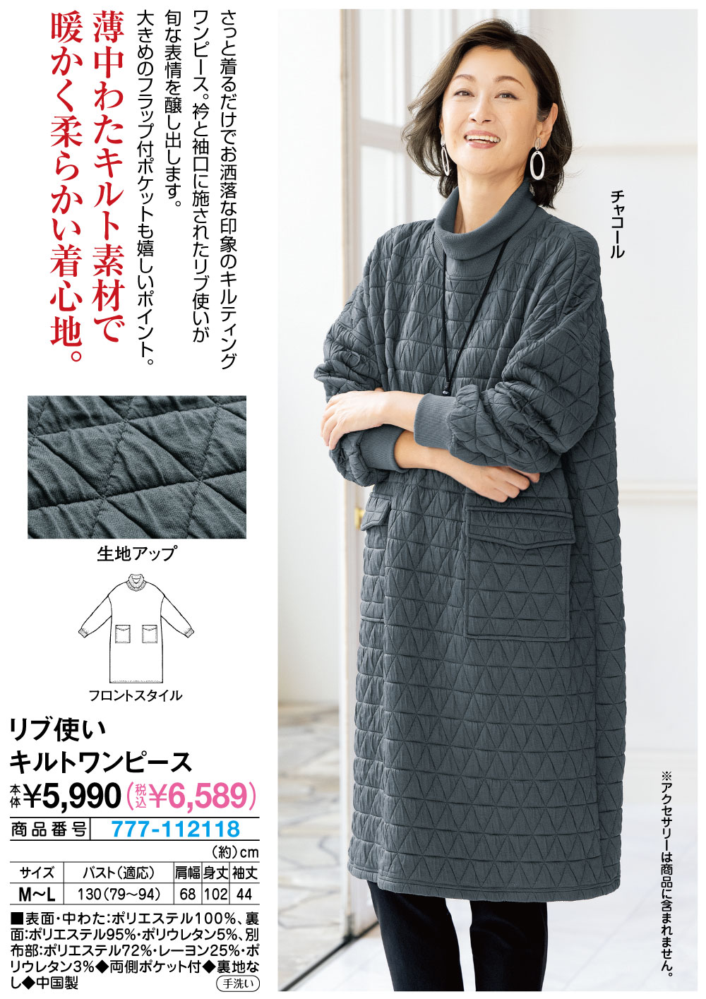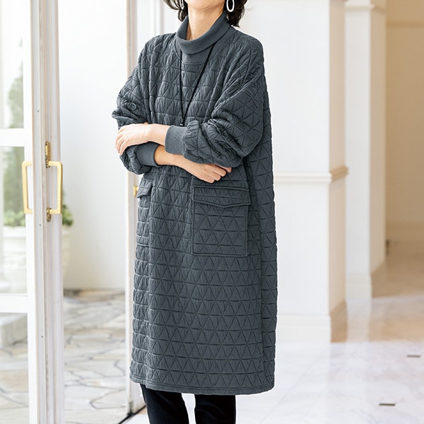 薄中わたキルト素材で暖かく柔らかい着心地! さっと着るだけでお洒落な印象のキルティングワンピース。衿と袖口に施されたリブ使いが旬な表情を醸し出します。 大きめのフラップ付ポケットも嬉しいポイント。