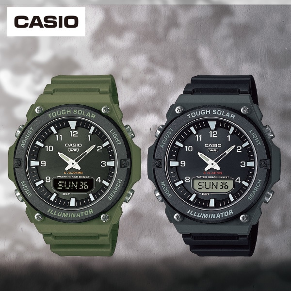 ソーラー駆動、10気圧防水!タフなデザインも魅力の<カシオ>ミリタリーウオッチ! 航空計器をモチーフに、メタルのビスやボタンなど細部までこだわりが詰まったデザインです。 【太陽の光をパワーに変えるソーラー充電】 ・タフソーラー(大容量ソーラー充電システム) 太陽光や蛍光灯の光で充電できるソーラーシステムを採用。 ◆フル充電で約4ヵ月駆動 LEDライトで暗闇での視認性を確保。 ●10気圧防水 ●ベルト/ピンバックルタイプ