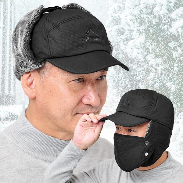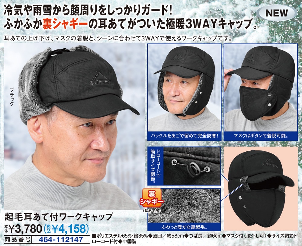 冷気や雨雪から顔周りをしっかりガード! ふかふか裏シャギーの耳あてがついた極暖3WAYキャップ。 耳あての上げ下げ、マスクの着脱と、シーンに合わせて3WAYで使えるワークキャップです。 バックルをあごで留めて完全防寒! マスクはボタンで着脱可能。 ドローコードで簡単サイズ調節。 ふわっと暖かな裏起毛。