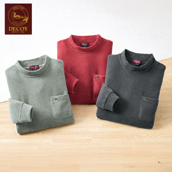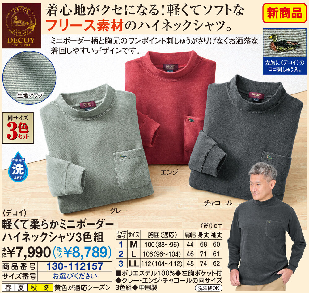 着心地がクセになる!軽くてソフトなフリース素材のハイネックシャツ! ミニボーダー柄と胸元のワンポイント刺しゅうがさりげなくお洒落な着回しやすいデザインです。 左胸にデコイのロゴ刺しゅう入。 ●同サイズ3色セット