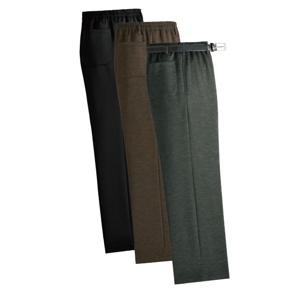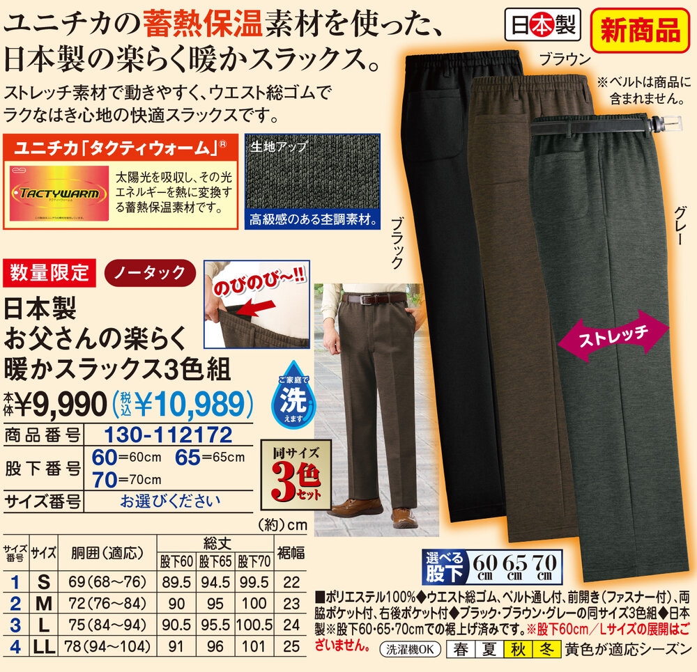 ユニチカの蓄熱保温素材を使った、日本製の楽らく暖かスラックス! ストレッチ素材で動きやすく、ウエスト総ゴムでラクなはき心地の快適スラックスです。 高級感のある杢調素材。 【ユニチカ「タクティウォーム」(R)】 太陽光を吸収し、その光エネルギーを熱に変換する蓄熱保温素材です。 ●ノータック ●ストレッチ ●同サイズ3色セット