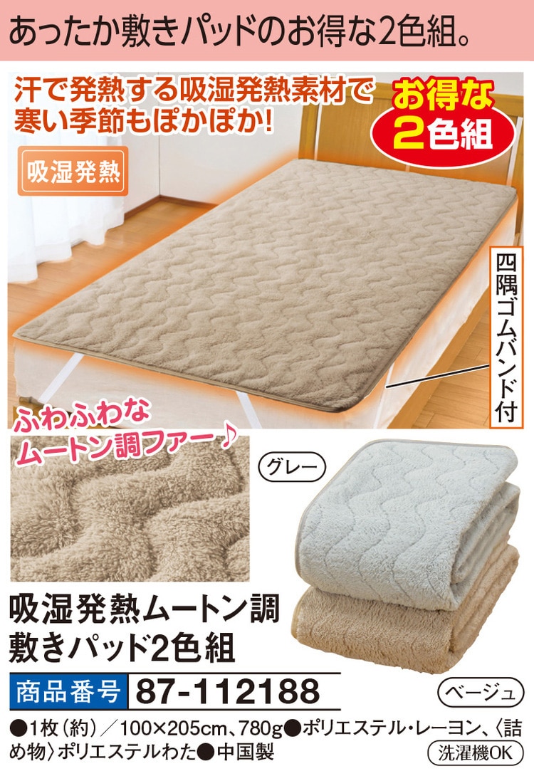 あったか敷きパッドのお得な2色組! 汗で発熱する吸湿発熱素材で寒い季節もぽかぽか! ふわふわなムートン調ファー♪ ●お得な2色組 ●吸湿発熱 ●四隅ゴムバンド付