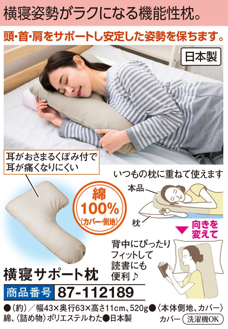 横寝姿勢がラクになる機能性枕! 頭・首・肩をサポートし安定した姿勢を保ちます。 耳がおさまるくぼみ付で耳が痛くなりにくい いつもの枕に重ねて使えます 向きを変えて背中にぴったりフィットして読書にも便利♪ ●綿100%(カバー・側地)