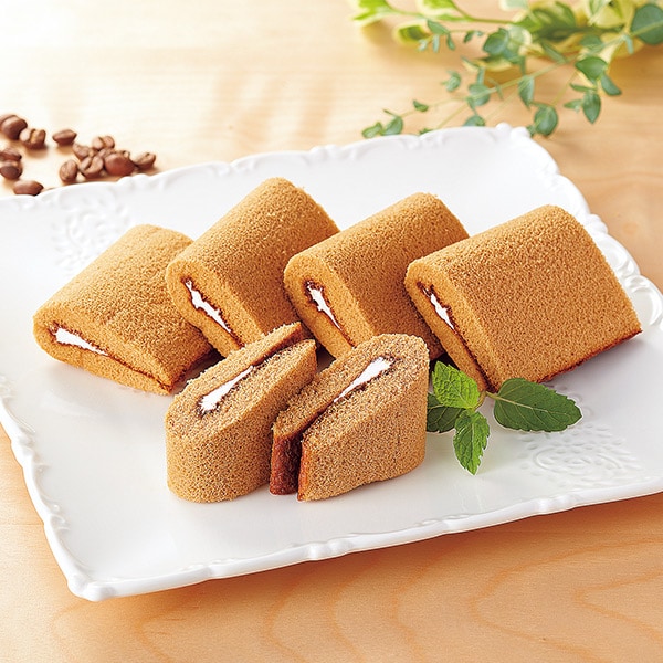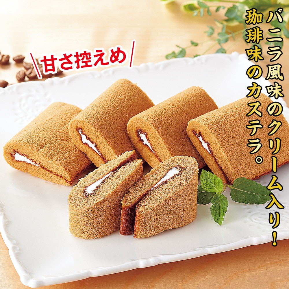 バニラ風味のクリーム入り! 珈琲味のカステラ。 甘さ控えめ。