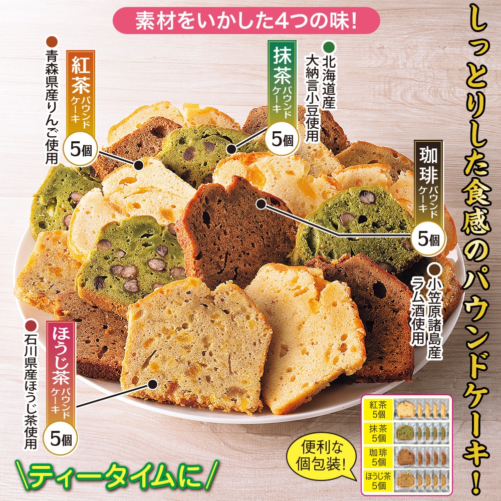 素材をいかした4つの味! 4つの味が楽しめるパウンドケーキの詰合せです。 素材の美味しさが広がるしっとりした食感です。 ・抹茶 北海道産大納言小豆使用 ・珈琲 小笠原諸島産ラム酒使用 ・紅茶 青森県産りんご使用 ・ほうじ茶 石川県産ほうじ茶使用