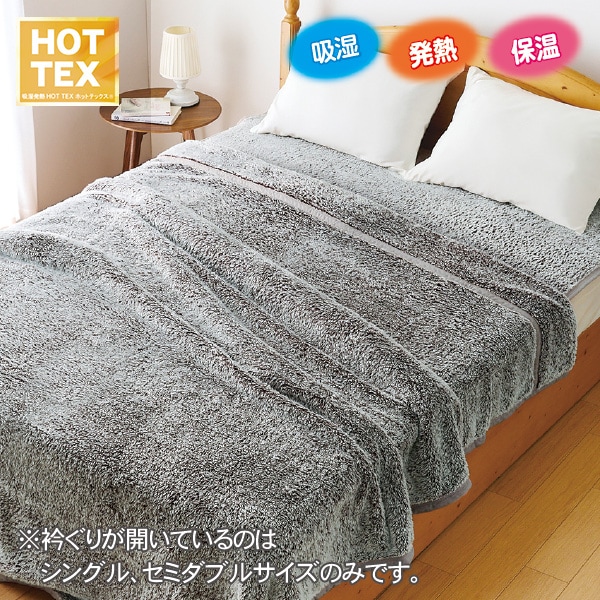 【ミンクファーみたいな柔らかさと暖か】 毛足の長い極細マイクロファイバーが空気をたっぷりと含み、ふわふわで暖か! 熱を逃さない高密度織で保温性にも優れています。 【吸湿発熱素材「HOTTEX」】 水分と反応して発熱する素材「ホットテックス」を使用。 肌に触れた瞬間から暖かく、温もりをキープします。 【首や肩まですっぽり暖か!】 シングル・セミダブルは衿ぐりタイプ! 寝返りしてもすき間ができずスースーしない! 【家族でも使えて便利!】 ダブルは衿ぐりなしタイプ ◎敷きパッドは四隅にゴムバンド付 ◎吸湿発熱 ◎保温 ◎洗濯機OK(※洗濯ネット使用) 【セット内容】 発熱毛布・発熱敷きパッド・ひざかけ・洗濯ネット×各1枚