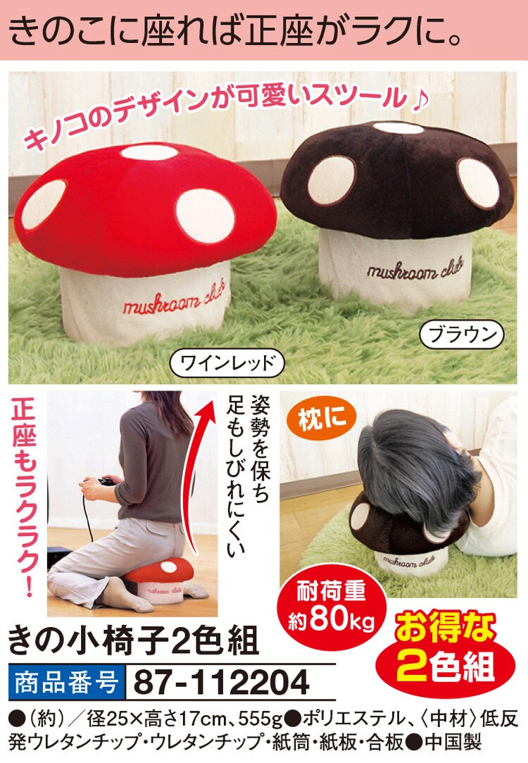 きのこに座れば正座がラクに! キノコのデザインが可愛いスツール♪ 正座もラクラク! 姿勢を保ち足もしびれにくい ●枕に ●おトクな2色組 ●耐荷重約80kg