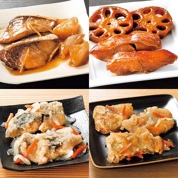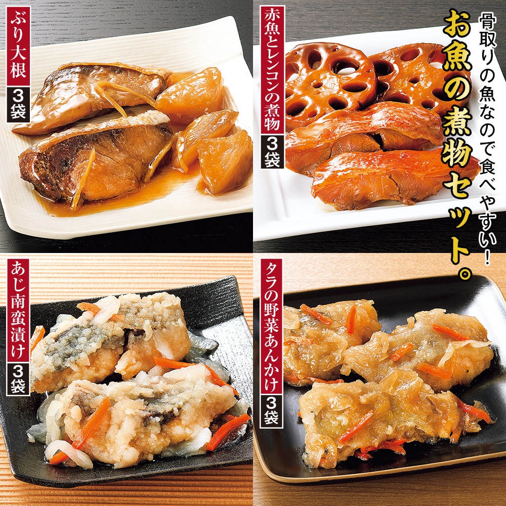 ●セット内容/4種各90g×3袋<計12袋> ●賞味期限/製造日から冷凍1年 ●加工地/日本 ●原材料/<ぶり大根>ブリ(日本)、だいこん、みりん干し調味液(しょうゆ、砂糖、水あめ、みりん)、上白糖、しょうが/pH調整剤、増粘多糖類<赤魚とレンコンの煮物>赤魚(ノルウェー又はアメリカ)、れんこん、醤油、砂糖、米発酵調味料、食塩、魚醤、麦芽エキス、酵母エキス、魚介エキス/増粘剤(加工澱粉)<あじ南蛮漬け>あじ(ニュージーランド)、タマネギ、米酢、にんじん、上白糖、打ち粉、食用植物油脂、しょうゆ風調味料、かつお節調味液、こんぶ調味液、食塩/酸化珪素、調味料(アミノ酸等)、甘味料(甘草)、V.B1、安定剤(キサンタン)、酢酸、酒精<たらと野菜のあんかけ>白身魚竜田揚げ(すけそうだら(国産)、食塩、衣(澱粉)、揚げ油(大豆油))、タマネギ、あんかけのたれ(醤油、ぶどう糖果糖液糖、醸造酢(米酢、米黒酢)、砂糖、蜂蜜、昆布エキス、酵母エキス、魚介エキス)、にんじん/増粘剤(加工澱粉)、調味料(アミノ酸) ●特定原材料等 /<ぶり大根>小麦・大豆<赤魚とレンコンの煮物>小麦・大豆<あじ南蛮漬け>小麦・乳成分・大豆<タラの野菜あんかけ>小麦・乳成分・大豆