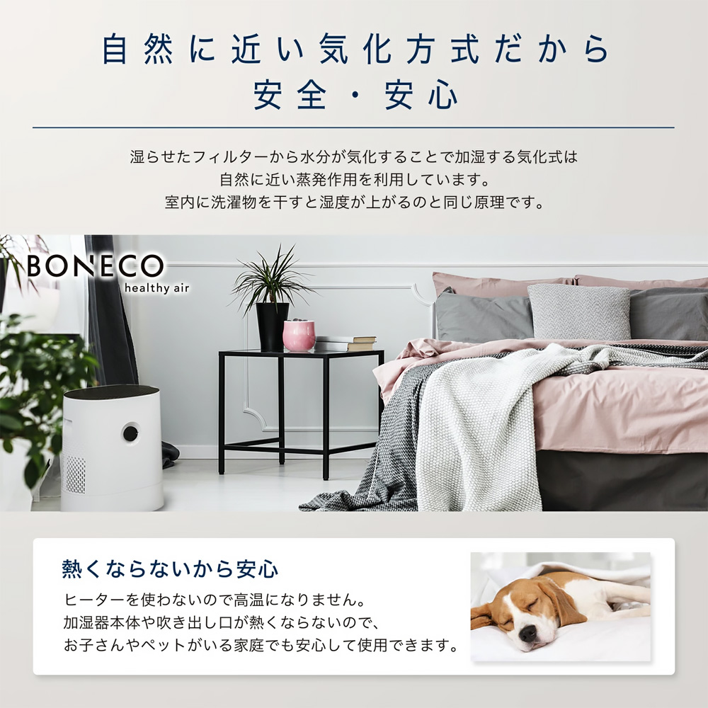 自然に近い気化方式だから 安全・安心! 湿らせたフィルターから水分が気化することで加湿する気化式は自然に近い蒸発作用を利用しています。 ヒーターを使わないので高温になりません。 加湿器本体や吹き出し口が熱くならないので、お子さんやペットがいる家庭でも安心して使用できます。 ◎フィルター部分は簡単に洗えます ◎シルバースティックの銀の抗菌作用によって、タンク内の雑菌の繁殖を抑えます ◎抗菌加工のタンク ◎アロマトレイ付き お部屋の湿度を快適に保って、あなたの家族を元気に。 冬になると流行するウイルスは、湿度が40%以下になると活発に活動を始めます。 室内環境を快適に整えることが、ウイルス対策ではとても大切です。