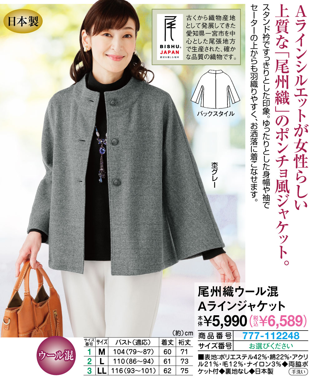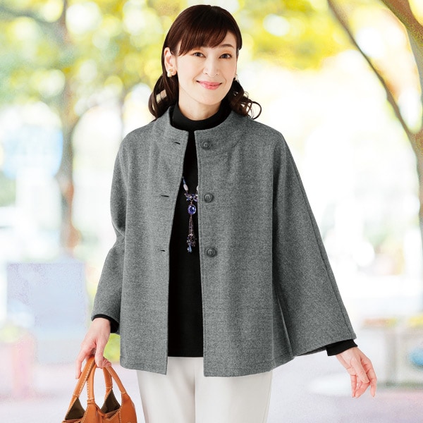 Aラインシルエットが女性らしい上質な「尾州織」のポンチョ風ジャケット! スタンド衿ですっきりとした印象。ゆったりとした身幅や袖でセーターの上からも羽織りやすく、お洒落に着こなせます。 古くから織物産地として発展してきた愛知県一宮市を中心とした尾張地方で生産された、確かな品質の織物です。